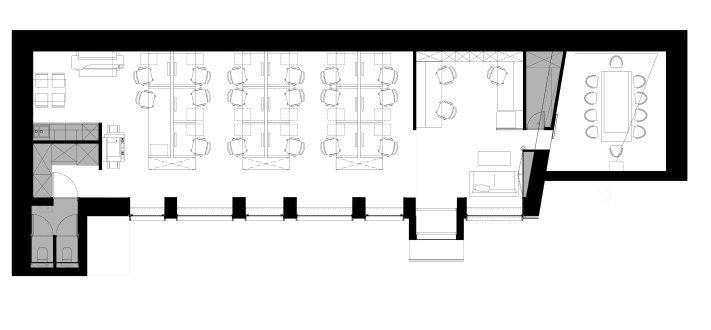 Wnętrze to duża, biała przestrzeń sprzyjająca pracy kreatywnej i przeciwdziałająca przebodźcowaniu. Wszelkie funkcje dodatkowe, takie jak toalety, kuchnia, szafy do przechowywania czy szatnia, zostały ukryte w masywie ścian". Odizolowana taką "ścianą" i szklanymi drzwiami, została również sala konferencyjna. Charakter jej wnętrza determinują przede wszystkim surowe, pobielone mury - oryginalna tkanka starej kamienicy. Najważniejszą rolę w przestrzeni pracowni pełnią wielkie okna wychodzące na dziedziniec - skupiają wzrok i pozwalają oderwać się od pracy, odetchnąć i zrelaksować wzrok, patrząc na zielony dziedziniec.